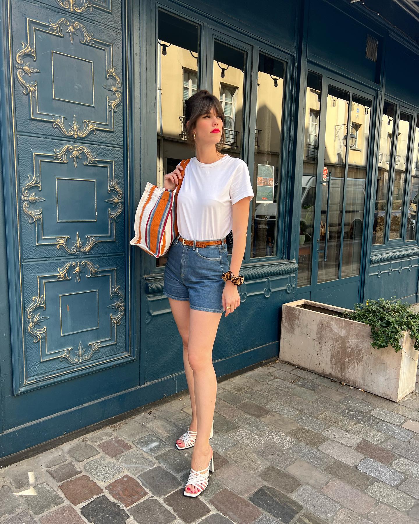 Áo thun trắng và quần denim short là công thức mà bạn có thể áp dụng từ đi dạo phố tới du lịch. Bộ đồ trên ghi điểm ở sự trẻ trung, năng động và không bao giờ lỗi mốt. Quần short vốn đã tôn dáng hiệu quả nhưng nếu bạn sơ vin, đi sandal cao gót, chiều cao sẽ càng được "ăn gian" tối ưu.