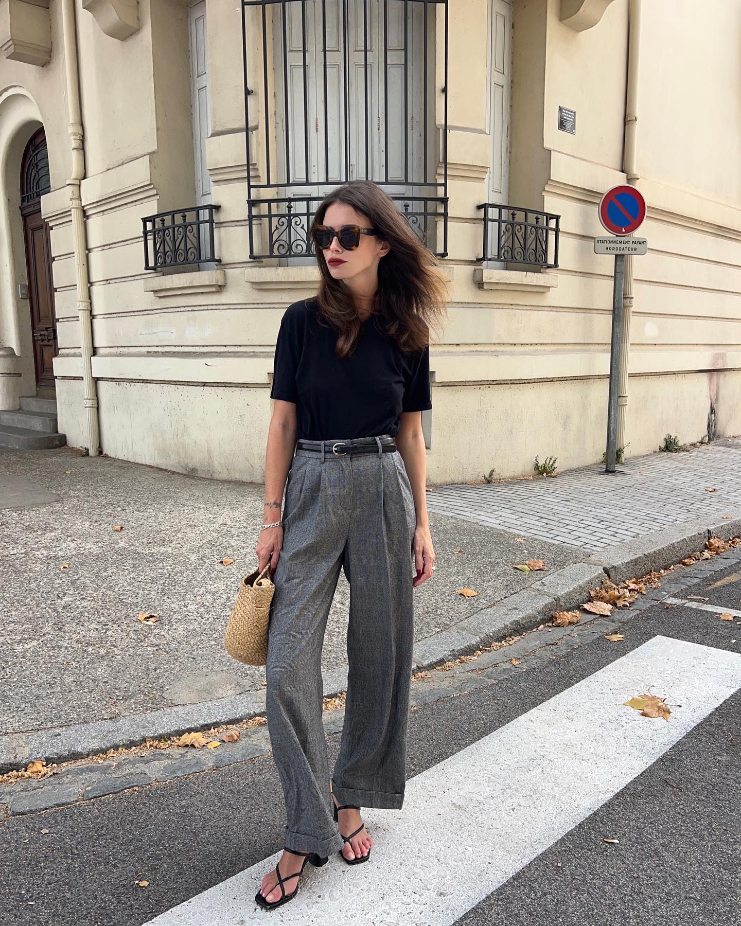 Áo thun đen và quần âu màu ghi xám là công thức ai cũng có thể mặc đẹp. Dù mang tông màu trầm làm chủ đạo, sự kết hợp này vẫn trẻ trung, thời thượng. Để vẻ ngoài thêm yêu kiều và thanh lịch, các nàng đừng quên sơ vin gọn gàng, đi sandal cao gót, rồi tô son môi đỏ sang trọng.
