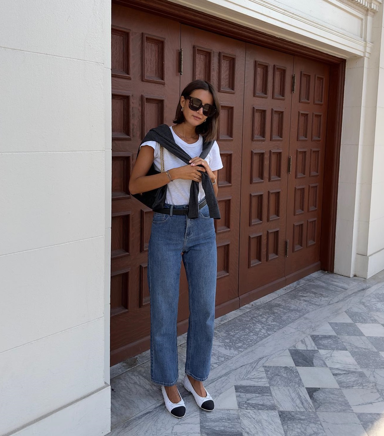Áo thun trắng và quần jeans ống đứng là công thức diện đồ đẹp kinh điển với thời gian. Chị em có thể tạo điểm nhấn cho bộ trang phục với một chiếc áo quàng vai, khuyên tai tròn, thắt lưng da và kính mắt. Không chỉ giúp outfit thêm ấn tượng, những món đồ trên còn nâng tầm vẻ sang xịn mịn cho bộ cánh.