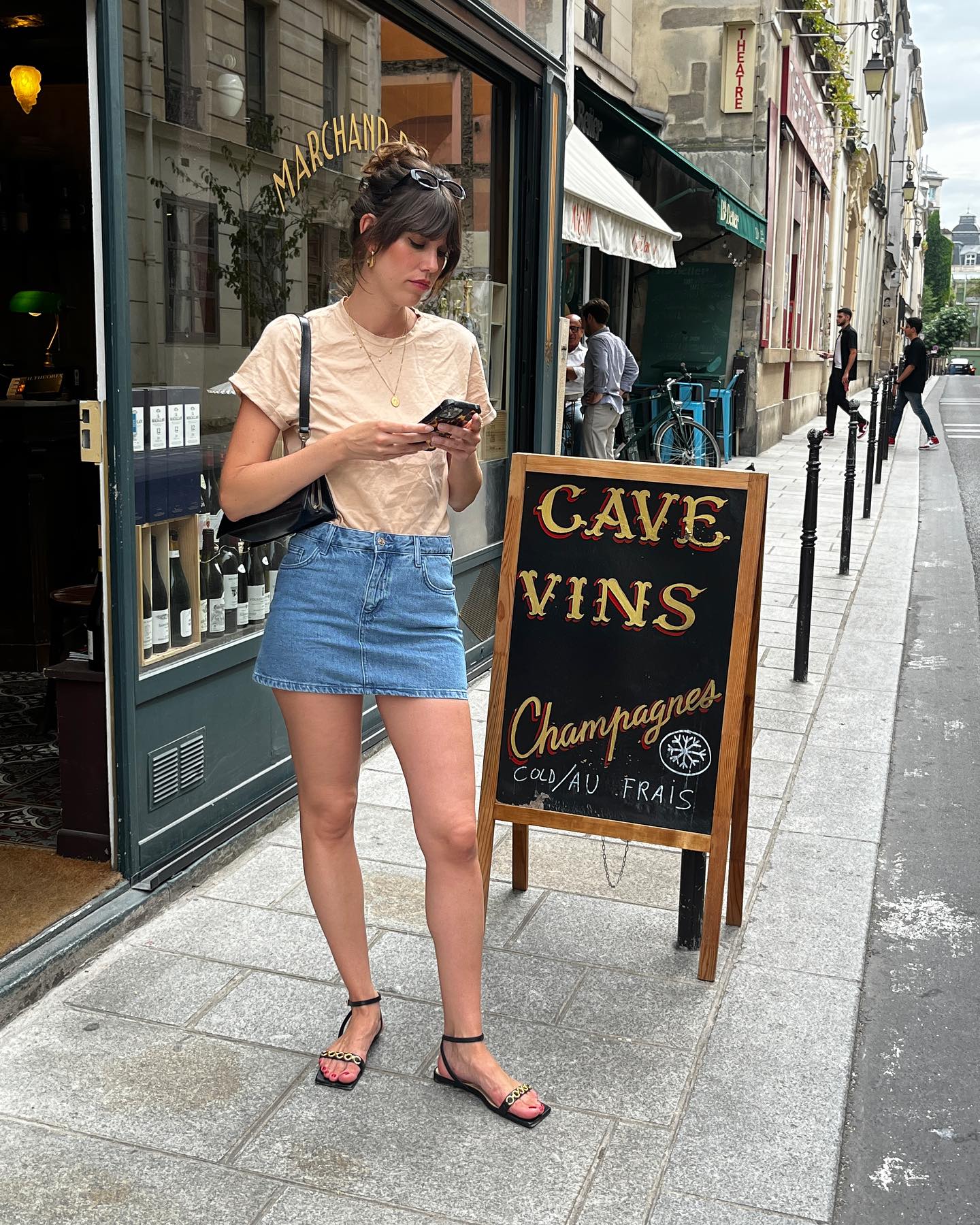 Khi dạo phố cuối tuần, chị em hãy thử áp dụng công thức gồm áo thun màu be kết hợp với chân váy ngắn denim. Bộ đôi này ghi điểm ở sự trẻ trung, năng động và không kém phần nữ tính. Các món đồ như sandal quai mảnh, túi xách màu đen đều phù hợp với tổng thể trang phục.
