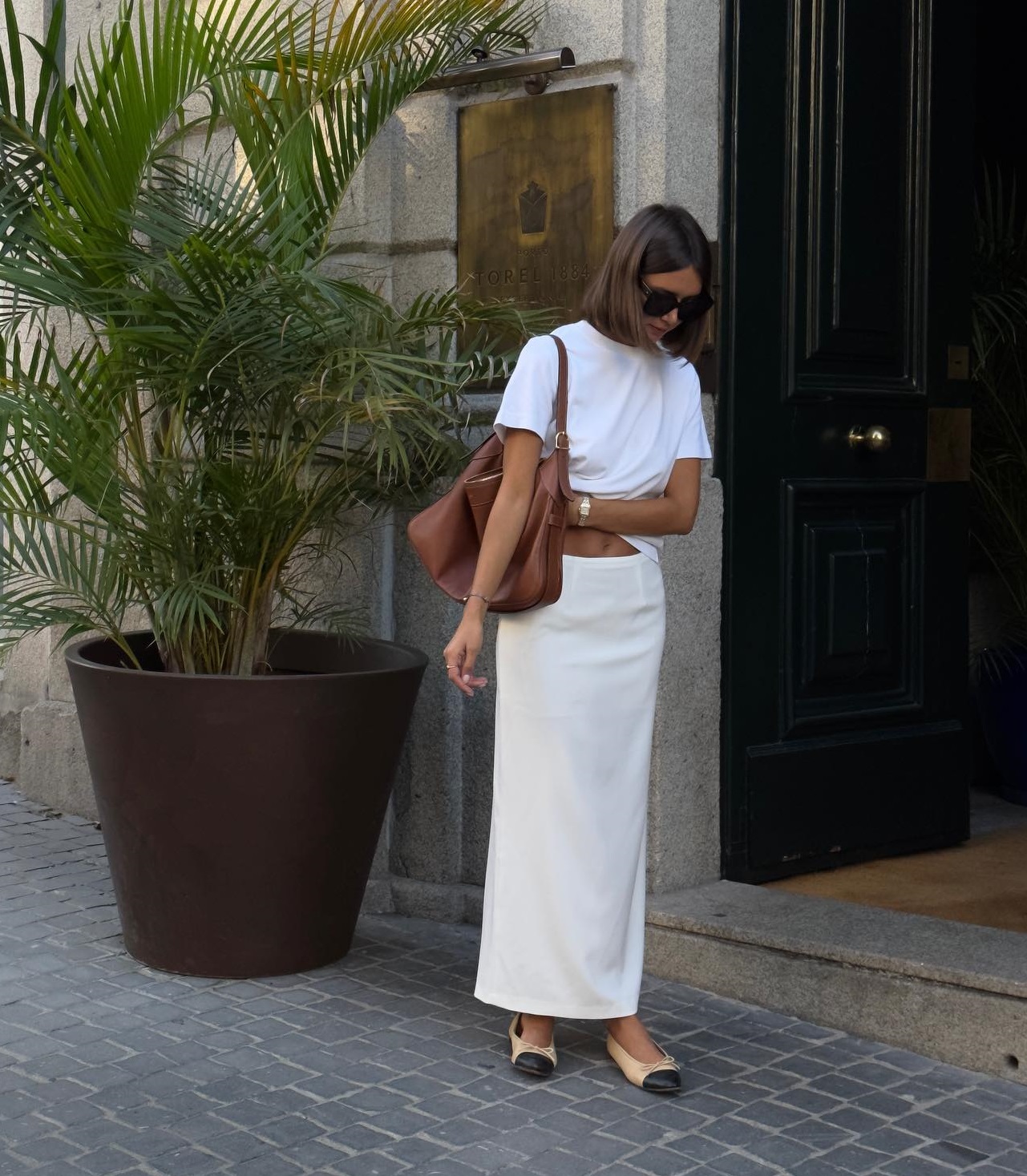 Áo thun trắng không chỉ phù hợp với quần ống rộng, mà còn mix được cùng chân váy nữ tính. Để đảm bảo nét tinh tế, hài hòa của set áo thun và chân váy trắng, quý cô người Pháp đã chọn túi xách màu nâu cùng đôi giày búp bê hai tông màu nhã nhặn.