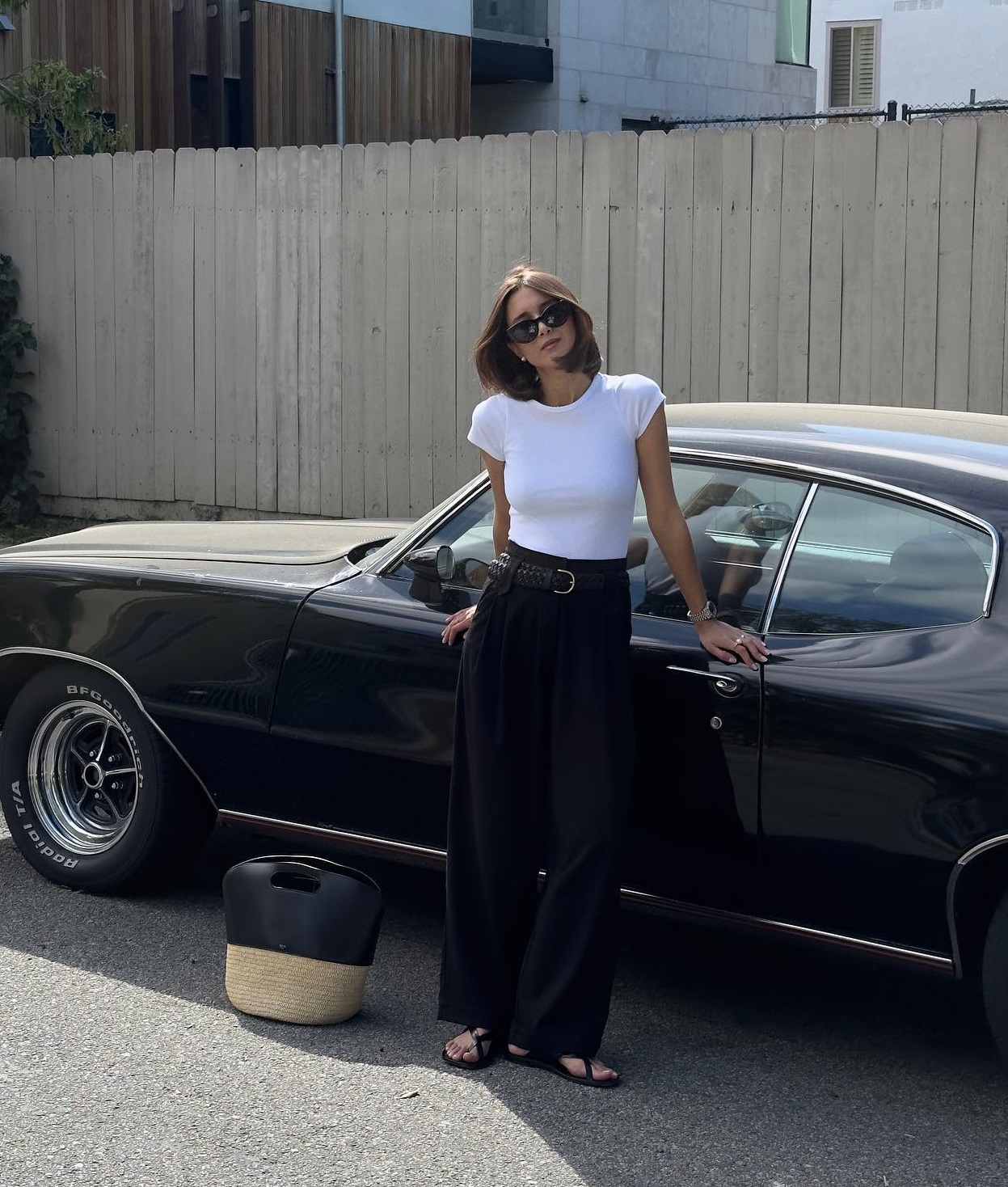Nếu theo đuổi phong cách tối giản, chị em nên ghim công thức gồm áo thun trắng kết hợp với quần âu tông màu đen. Chỉ cần sơ vin gọn gàng, bộ trang phục sẽ trở nên thanh lịch, tinh tế hơn. Đôi sandal màu đen rất phù hợp với outfit trẻ trung, trang nhã trên.