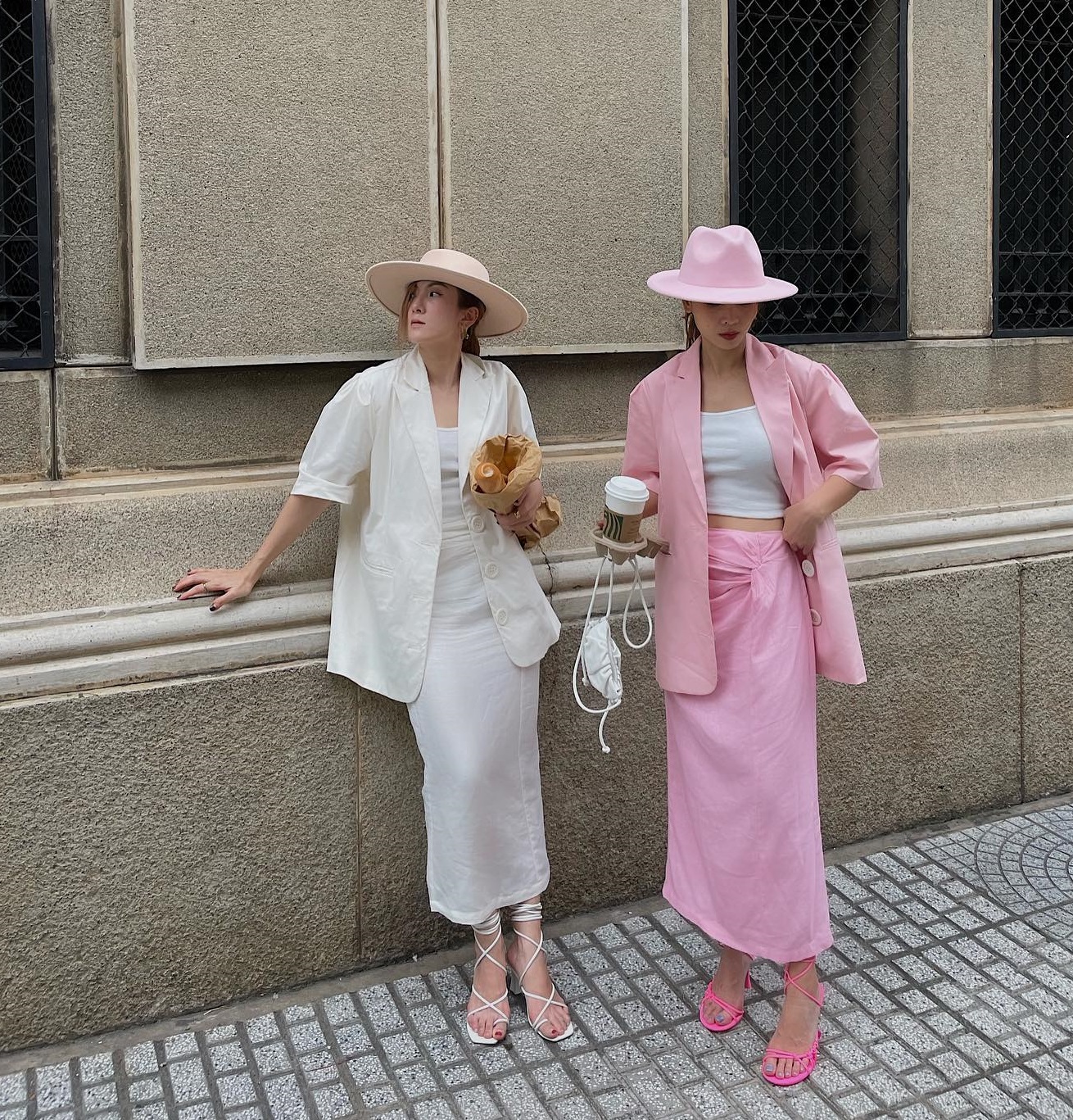 Chị em Yến Trang và Yến Nhi gợi ý cho các nàng cách diện bộ suit váy nữ tính, thanh lịch trong mùa thu. Nếu yêu thích sự đơn giản, bộ suit váy màu trắng là lựa chọn lý tưởng. Ngọt ngào và tươi xinh hơn là bộ suit váy màu hồng pastel. Để tăng thêm phần phóng khoáng, sành điệu cho bộ trang phục, Yến Trang và Yến Nhi đã khéo léo chọn sandal buộc dây nổi bật.