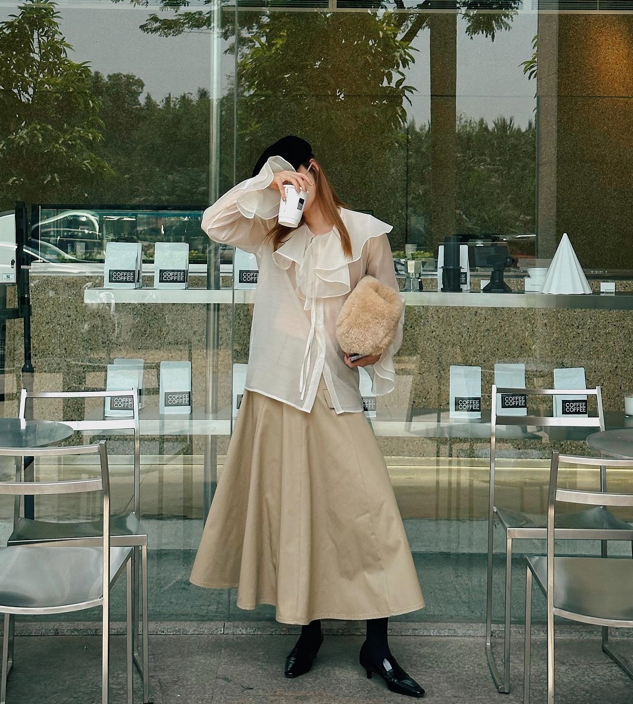 Áo blouse trắng và chân váy màu be kết hợp với nhau rất ăn ý. Hai món đồ này sẽ tạo nên bộ cánh trang nhã, nữ tính. Khi tô điểm một chiếc mũ nồi và đi giày đen, tổng thể trang phục của Yến Nhi càng thêm thời thượng, nổi bật.