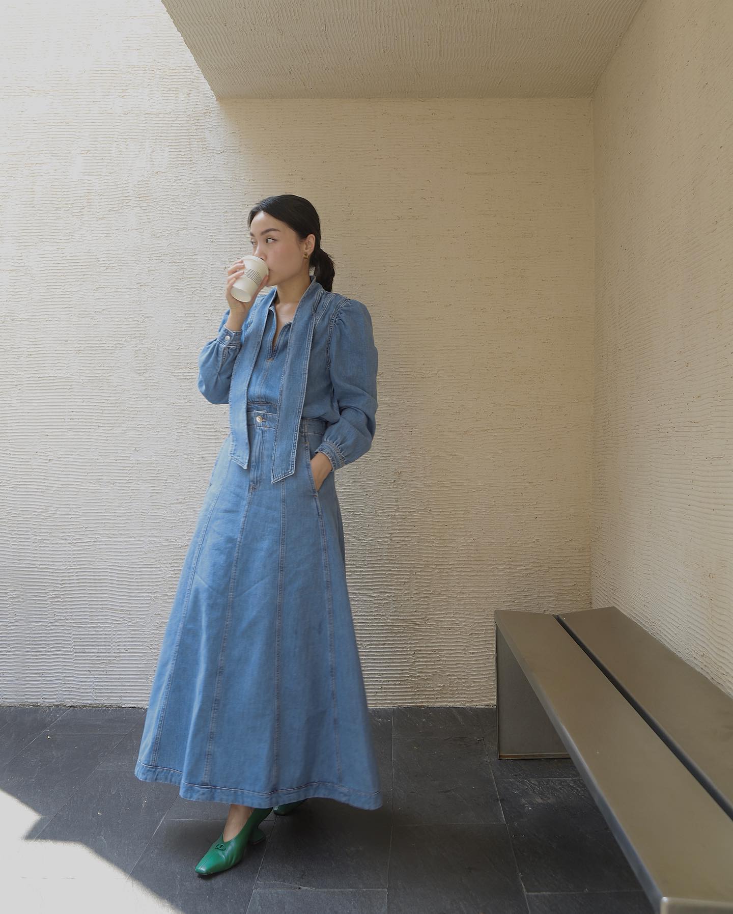 Các set đồ denim rất phổ biến trong mùa lạnh. Tuy nhiên thay vì áp dụng công thức áo sơ mi denim và quần jeans quen thuộc, Hà Trúc lại kết hợp áo blouse với chân váy dáng dài. Hai món thời trang này mang đến nét bụi bặm, trẻ trung xen lẫn vẻ nữ tính cho người mặc, từ đó phong cách cũng thêm mới mẻ.