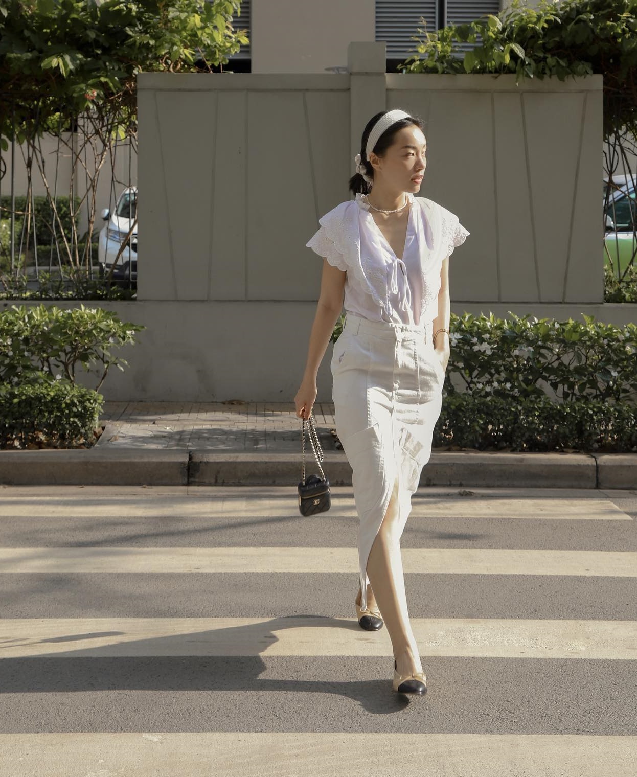 Diện bộ trang phục mang tông màu trắng làm chủ đạo nhưng vẻ ngoài của blogger Hà Trúc không hề nhạt nhòa. Cô kết hợp áo blouse bèo nhún với chân váy xẻ tà, tạo nên bộ trang phục yêu kiều, trẻ trung. Đôi giày hai tông màu giúp đảm bảo độ tinh tế cho outfit. Các món phụ kiện như vòng cổ ngọc trai, bờm tóc thì tăng thêm vẻ long lanh cho bộ đồ.