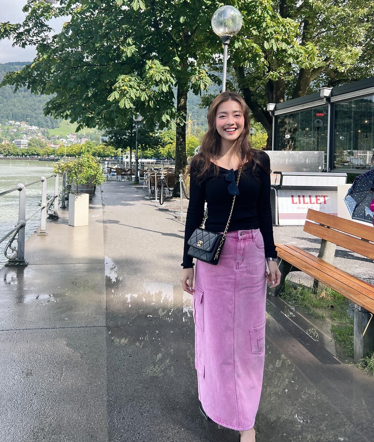 Kết hợp áo thun dài tay tông màu đen với chân váy hồng, Khả Ngân có được bộ trang phục nổi bật, nhưng vẫn có sự hài hòa. Thao tác sơ vin là khó có thể bỏ qua, nếu người mặc muốn hoàn thiện set trang phục tôn dáng và thanh lịch.