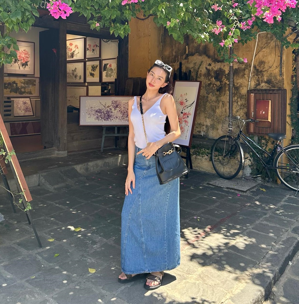 Bộ trang phục của Hoa hậu Thùy Tiên gồm các món đồ đơn giản như áo tank top trắng và chân váy denim. Dù không quá cầu kỳ nhưng hai món đồ này vẫn giúp người mặc có được vẻ ngoài sành điệu, hút mắt. Bộ trang phục trở nên có điểm nhấn hơn nhờ đôi sandal dáng thô cá tính, bụi bặm.