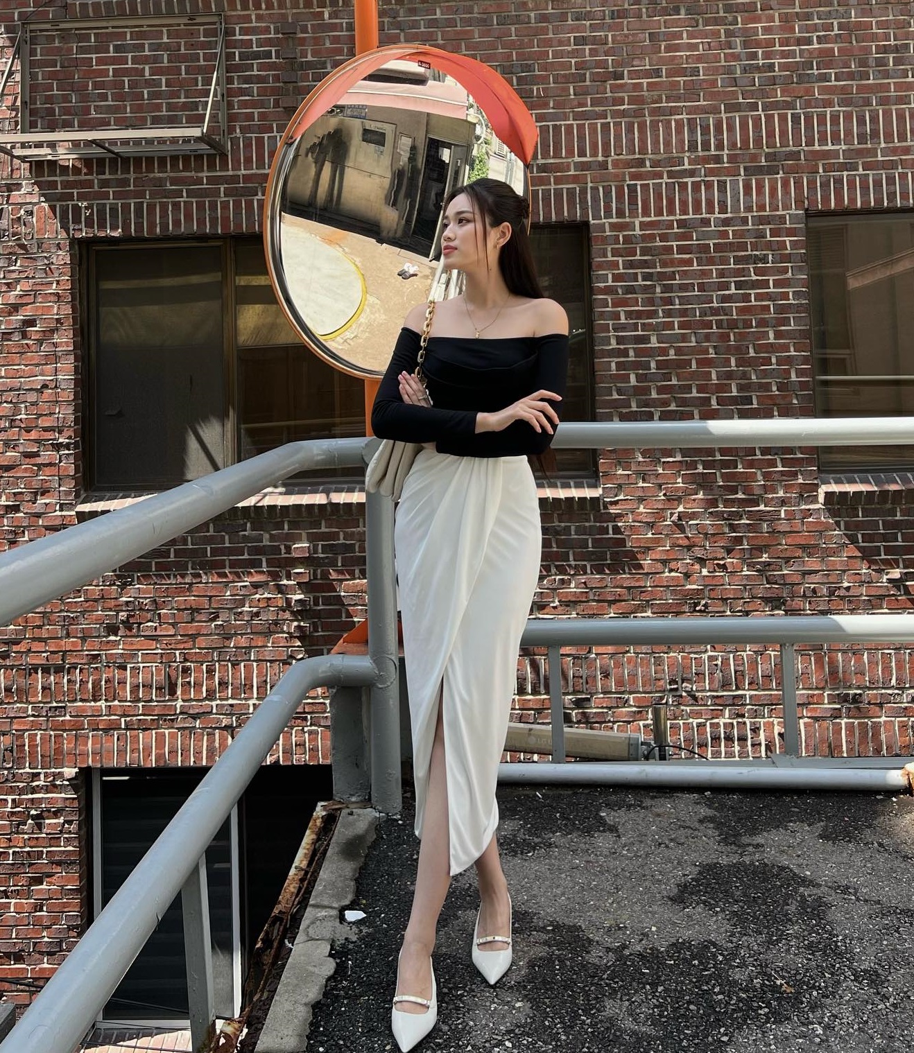 Hoa hậu Đỗ Thị Hà diện áo trễ vai theo cách đầy nữ tính, thanh lịch. Cụ thể, nàng hậu đã kết hợp áo trễ vai màu đen với chân váy trắng xẻ tà, và không quên sơ vin gọn gàng. Bộ trang phục còn cho hiệu quả tôn dáng tối ưu khi Đỗ Thị Hà chọn một đôi giày mũi nhọn.