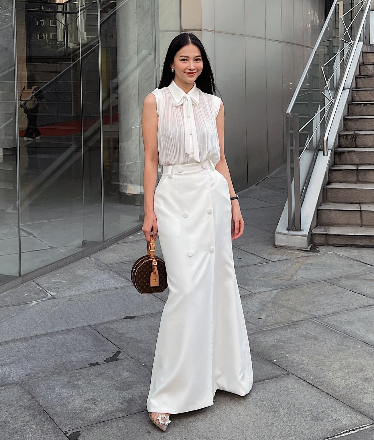 Không muốn phải suy nghĩ nhiều trong khoản phối đồ, chị em hãy tham khảo công thức gồm áo gile kết hợp với chân váy dài, cùng tông màu trắng của Hoa hậu Phương Khánh. Bộ trang phục này đầy nữ tính và sang trọng. Với các thiết kế chân váy dài thướt tha, chị em nên sơ vin để hoàn thiện bộ đồ chỉn chu, tôn dáng.