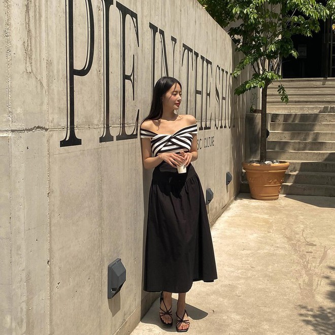 Set áo trễ vai kẻ ngang, chân váy chữ A màu đen có sự nổi bật nhưng vẫn hài hòa. Bộ cánh này còn tôn lên nét nữ tính, quyến rũ của người diện. Đôi sandal quai mảnh phù hợp với nét phóng khoáng, nữ tính của outfit. Yêu thích trang phục màu trung tính, chị em đừng bỏ qua công thức diện đồ cuốn hút trên.
