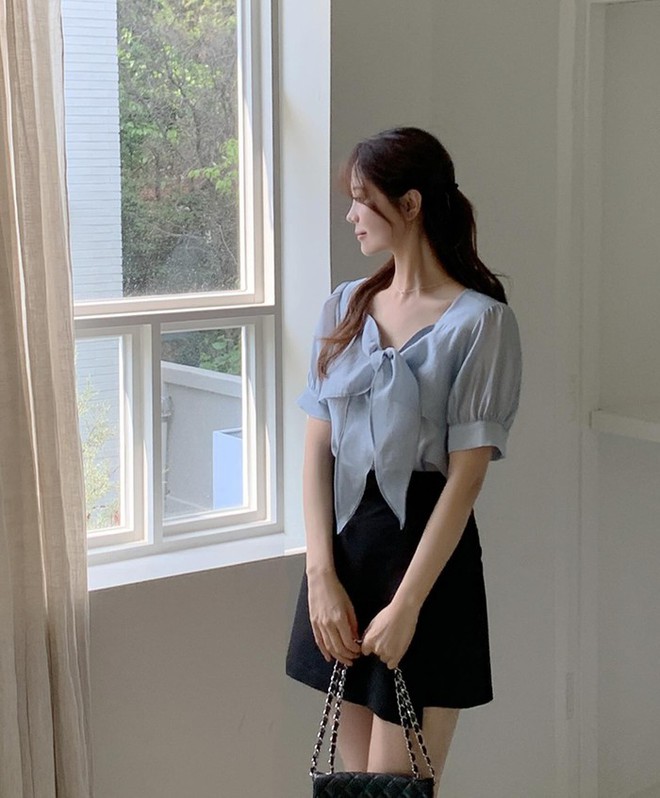 Áo sơ mi màu xanh pastel và chân váy đen dáng suông mang đến sự thanh lịch, nữ tính cho người diện. Dẫu vậy, công thức này vẫn có sự trẻ trung, ngọt ngào. Khi đi giày cao gót mũi nhọn, bạn sẽ hoàn thiện được outfit chỉn chu, đúng chất công sở.