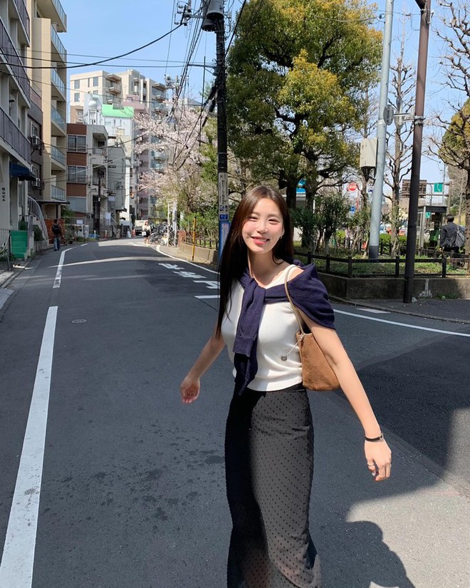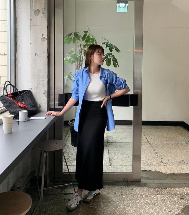Công thức áo tank top trắng và chân váy đen khá đơn giản nhưng nhờ khoác ngoài áo sơ mi xanh pastel, vẻ ngoài của người diện trở nên nổi bật hơn. Với các set đồ layer, sơ vin là thao tác nên thực hiện để đảm bảo độ gọn gàng, tránh bị "dìm" dáng. Đôi giày sneaker trắng rất trẻ trung nhưng vẫn có sự nữ tính, thích hợp để mix với chân váy.