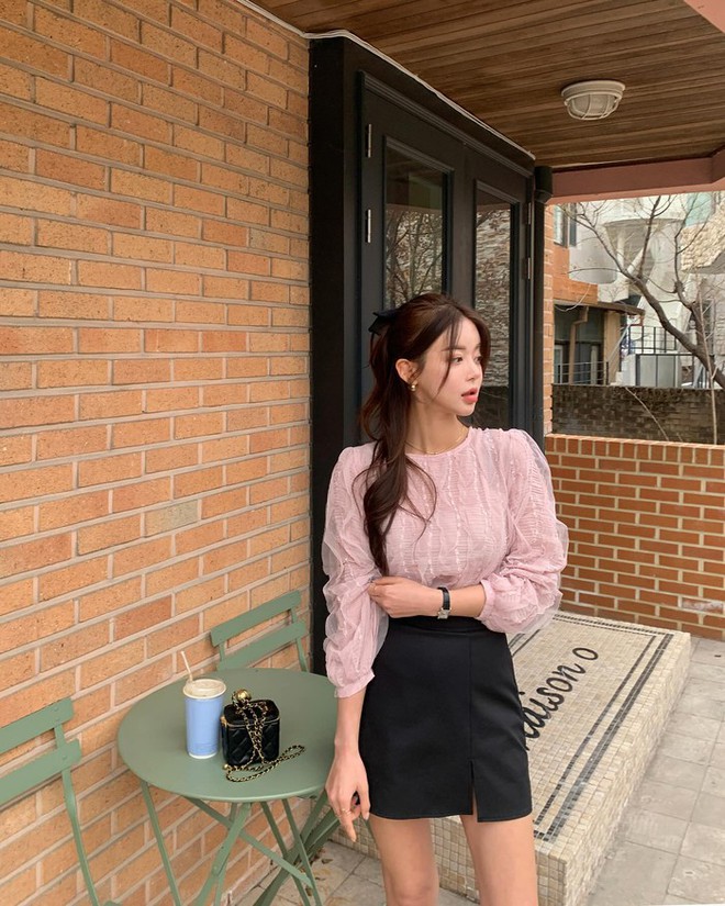 Mẫu áo blouse tông màu hồng chính là điểm nhấn của set trang phục trên. Thiết kế này có sự yêu kiều, sang trọng còn chân váy đen dáng ngắn lại ghi điểm trẻ trung, đồng thời giúp cân bằng outfit. Các nàng có thể áp dụng bộ cánh trên khi đi cà phê cuối tuần, thậm chí có thể mặc tới đám cưới.