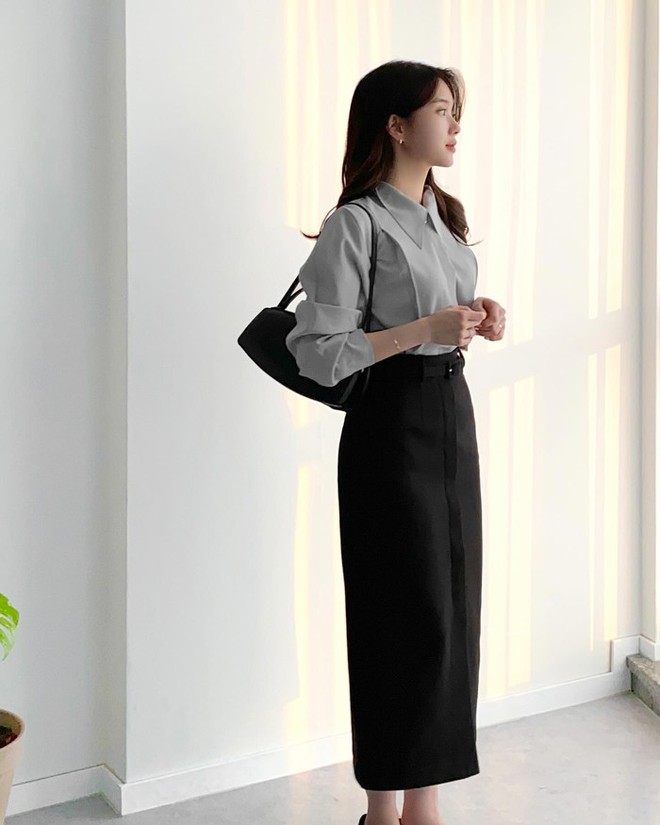 Thêm một công thức diện đồ rất chỉn chu, tinh tế nữa dành cho chị em, đó là combo áo ghi xám kết hợp với chân váy đen dáng ngắn. Đây là công thức ai cũng có thể mặc đẹp. Chị em hãy sơ vin gọn gàng và hoàn thiện outfit bằng một đôi sandal cao gót quai mảnh để kéo chân dài, "hack" chiều cao tối ưu. Các quý cô sở hữu chiều cao khiêm tốn rất nên tham khảo công thức diện đồ thanh lịch và tôn dáng trên.