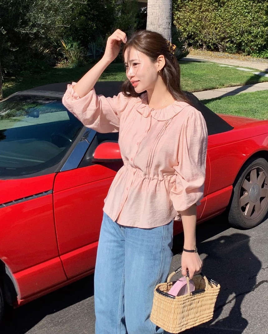Áo blouse màu hồng và quần jeans xanh kết hợp với nhau rất ăn ý. Chị em có thể diện bộ trang phục này khi đi làm hoặc dạo phố cuối tuần. Mẫu áo blouse nhấn eo không chỉ gọn gàng mà còn tôn dáng cao ráo, thon thả hơn.