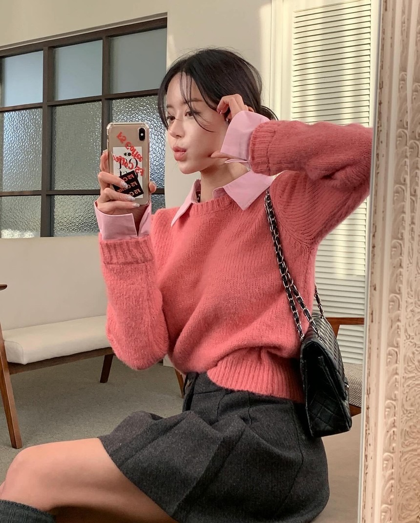 Bộ trang phục trên rất trẻ trung, ngọt ngào. Chân váy màu xám đậm cho hiệu quả cân bằng outfit và cộng thêm điểm sang xịn mịn. Outfit này vốn dĩ đã nổi bật, chị em nên tối giản hóa phụ kiện để giữ nguyên vẻ tinh tế.