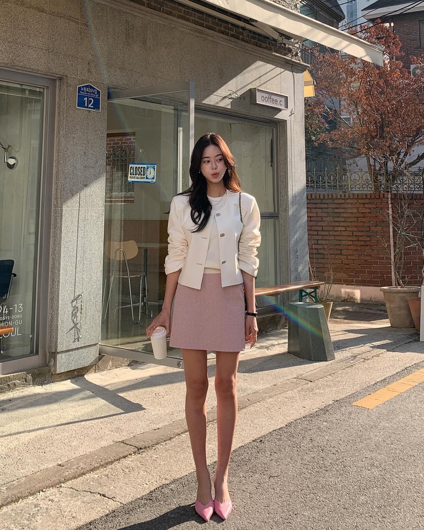 Chân váy vải tweed chính là "ngôi sao" của bộ trang phục trên. Để hoàn thiện vẻ ngoài sang trọng, các nàng nên kết hợp chân váy hồng vải tweed với áo thun và áo khoác trắng. Đôi giày cao gót mũi nhọn, tông màu hồng đã tăng thêm nét ngọt ngào cho bộ cánh.