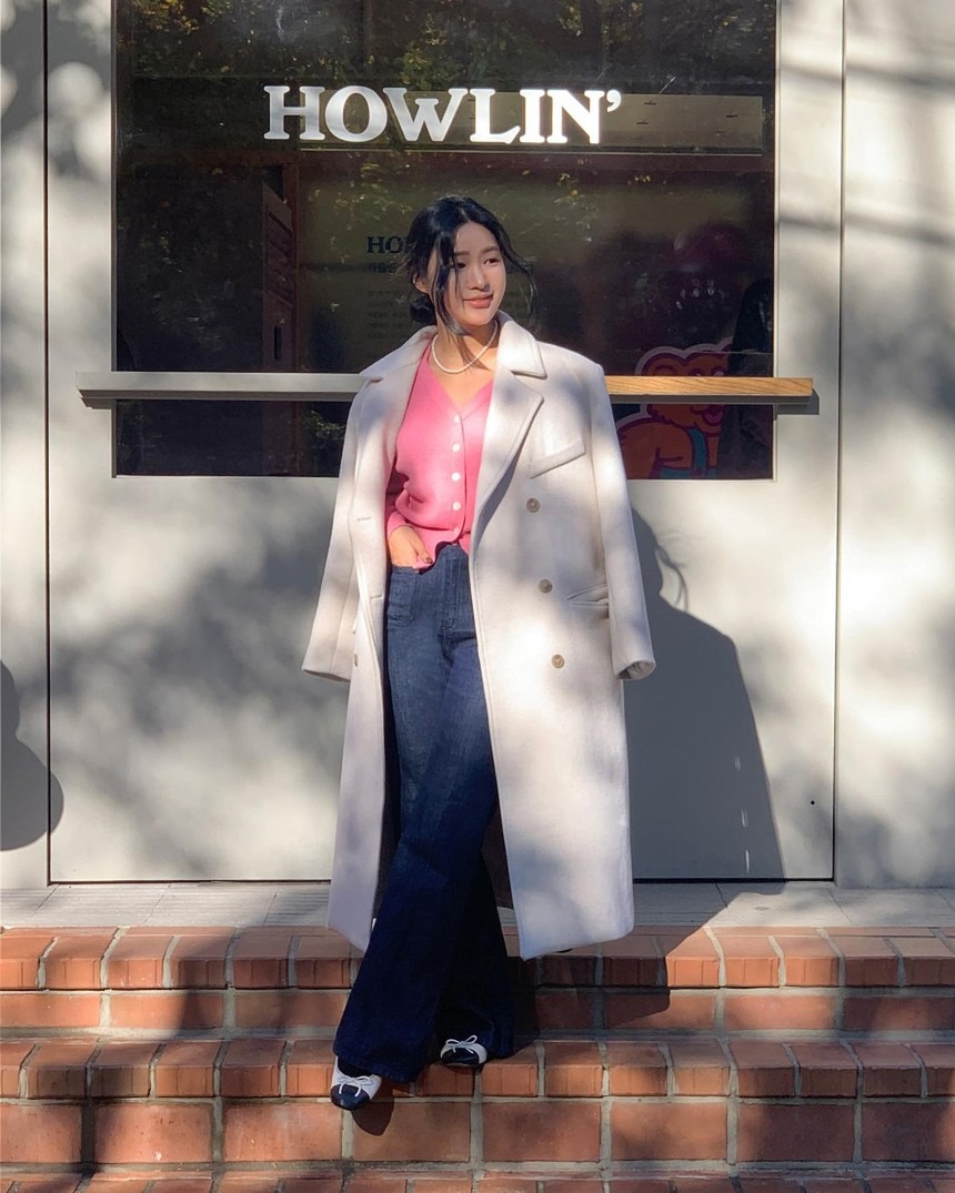 Áo cardigan màu hồng và quần jeans tối màu đã mang đến sự trẻ trung, sành điệu cho người mặc. Các món đồ như vòng cổ ngọc trai, áo khoác dạ màu trắng, giày búp bê gắn nơ mảnh đã hoàn thiện tổng thể trang phục thanh lịch, sang trọng.