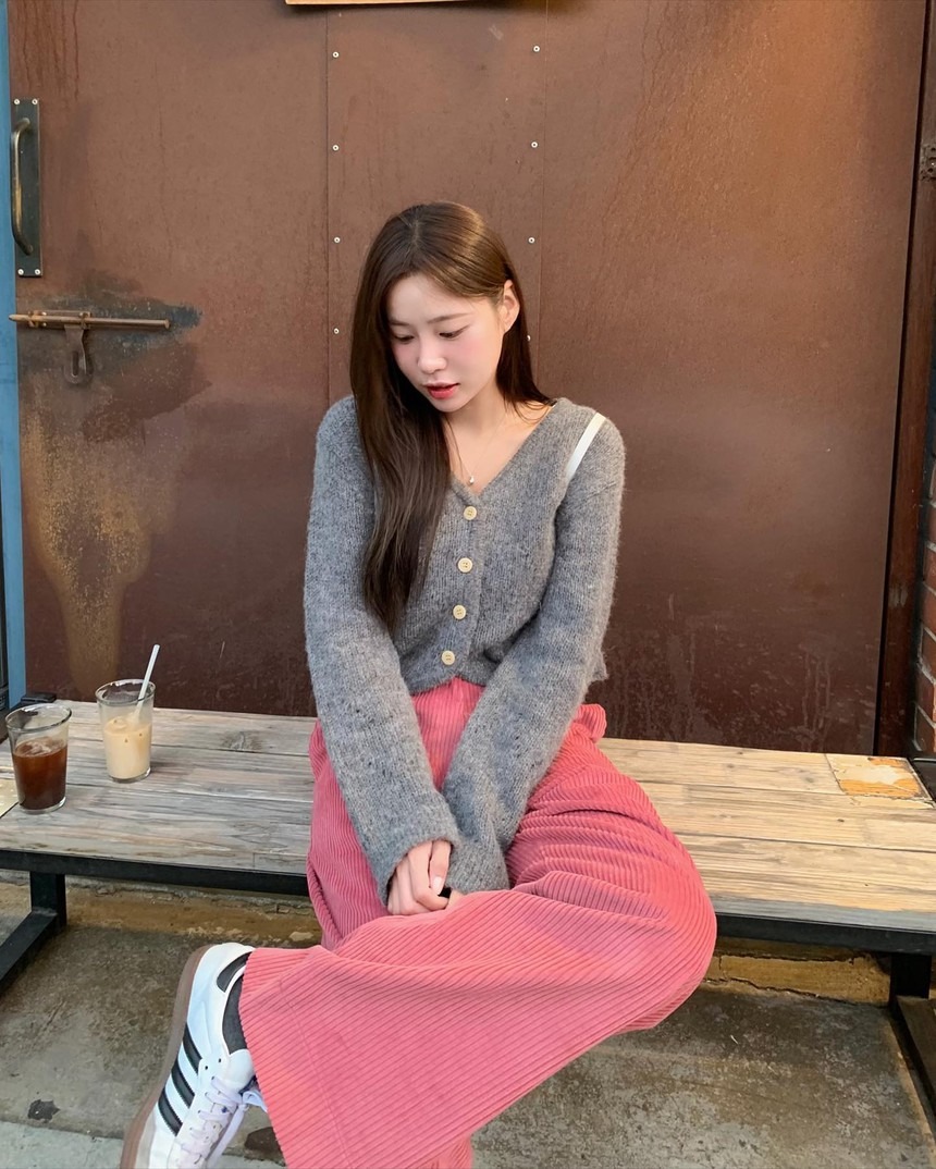 Công thức áo cardigan màu xám và quần màu hồng ghi điểm ở nét trang nhã, ngọt ngào. Đôi sneaker trắng là mảnh ghép hoàn hảo của bộ trang phục. Áo cardigan cổ chữ V mang đến hiệu quả tôn dáng cao ráo, thanh thoát.