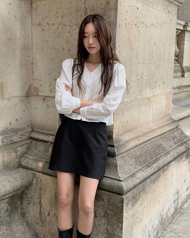 Áo blouse trắng và chân váy đen, dáng ngắn kết hợp với nhau rất ăn ý, giúp người mặc có được vẻ ngoài nữ tính, thanh lịch. Dù mang tông màu trung tính nhưng set đồ vẫn "hack" tuổi hiệu quả. Cuối cùng, một đôi boots da sẽ giúp nâng tầm phong cách.