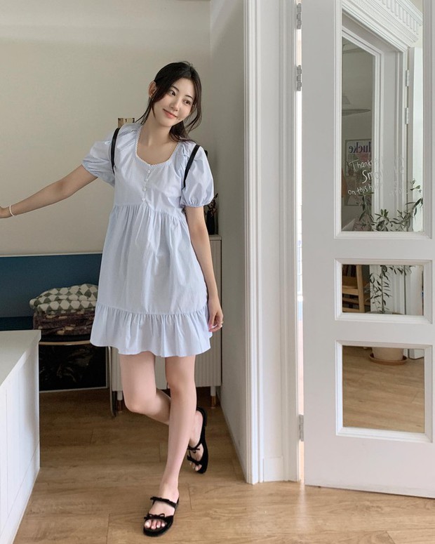 Mẫu váy tay bồng, mang tông màu xanh pastel có độ trẻ trung, xen lẫn nét trang nhã. Chị em có thể kết hợp mẫu váy này cùng sandal để tạo nên bộ trang phục đi dạo phố sành điệu, nữ tính. Chi tiết tay bồng của mẫu váy là điểm nhấn quan trọng, giúp vẻ ngoài thêm yêu kiều, sang xịn mịn.