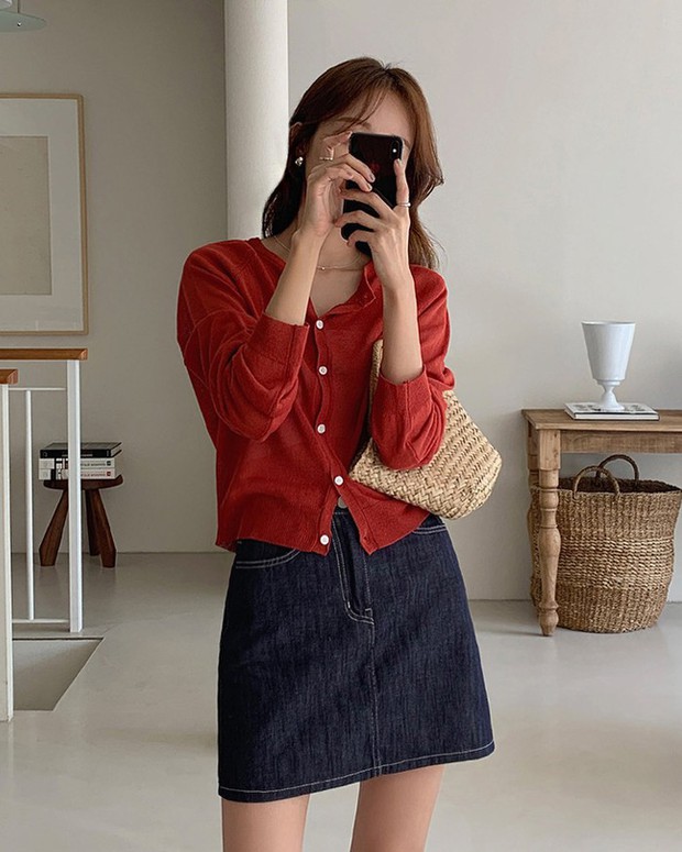 Trang phục tông màu đỏ đang là xu hướng trong mùa lạnh năm nay. Tuy nhiên, áo đỏ không phải là món thời trang dễ phối đồ. Cách để chinh phục mẫu áo này chính là kết hợp với chân váy denim tông màu đen. Nhờ vậy, bạn sẽ có được tổng thể trang phục hài hòa mà vẫn nổi bật, tươi trẻ.
