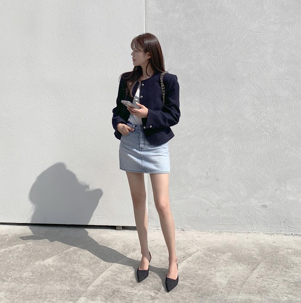 Áo khoác vải tweed chính là "bảo chứng" cho vẻ ngoài sang trọng, nữ tính. Dẫu vậy, bạn vẫn sẽ ghi điểm trẻ trung, thời thượng nếu kết hợp mẫu áo khoác này với áo thun trắng, chân váy denim ngắn. Đôi giày cao gót mũi nhọn tạo hiệu ứng chân thon dài hơn và "hack" chiều cao tối ưu. Ngoài ra, giày cao gót mũi nhọn còn cộng thêm điểm thanh lịch cho bộ cánh.