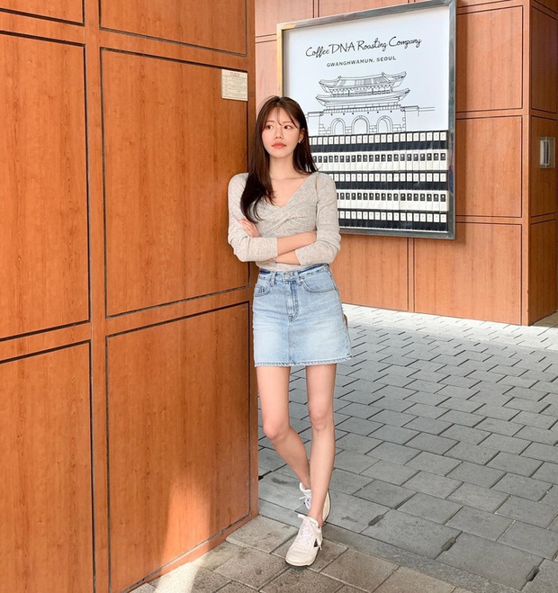 Khi kết hợp áo len mỏng cách điệu với chân váy denim dáng ngắn, chị em sẽ có được bộ trang phục nữ tính, dịu dàng. Công thức này cũng không kém phần trẻ trung, khỏe khoắn nhờ chân váy denim và đôi giày sneaker trắng.