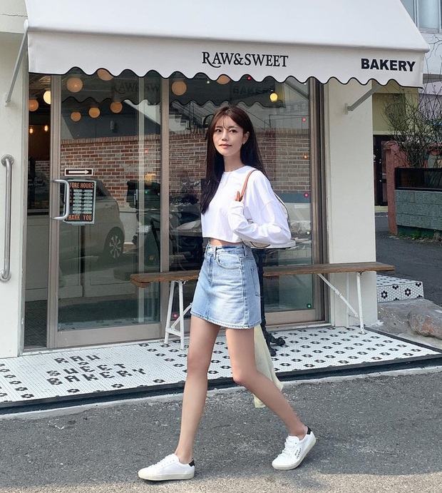 Yêu thích phong cách năng động và thoải mái, chị em đừng bỏ qua công thức áo thun trắng dài tay kết hợp với chân váy denim, giày sneaker trắng. Nhờ thiết kế áo dáng lửng, chiều cao càng được cải thiện tối ưu hơn.