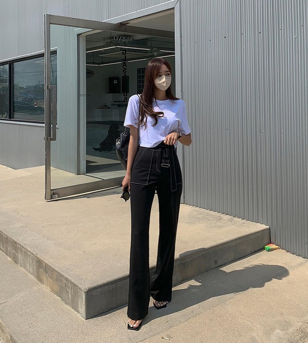 Công thức áo thun trắng dài ngang hông và quần cạp cao cho hiệu quả tôn dáng tối ưu. Với thiết kế quần dài ống loe, bạn nên kết hợp cùng sandal cao gót để cho hiệu quả "kéo chân" tốt hơn. Không chỉ cải thiện vóc dáng, bộ trang phục trên còn rất trẻ trung.