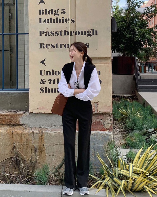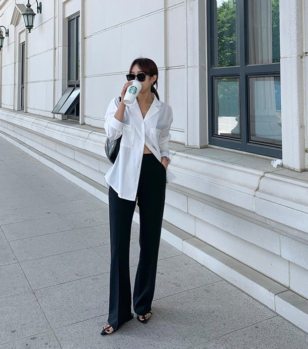 Sự kết hợp cơ bản nhất có lẽ là áo sơ mi trắng và quần đen. Dẫu vậy, bộ trang phục trên vẫn có sự mới mẻ nhờ thiết kế quần ống loe và đôi sandal quai mảnh sành điệu. Để không làm giảm sự hài hòa của tổng thể bộ đồ, quý cô trên đã khéo léo chọn một chiếc túi xách màu đen.