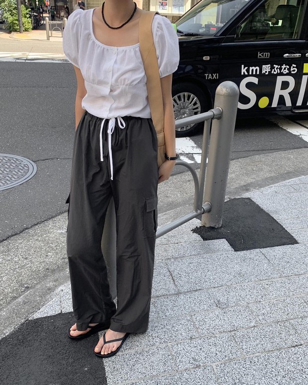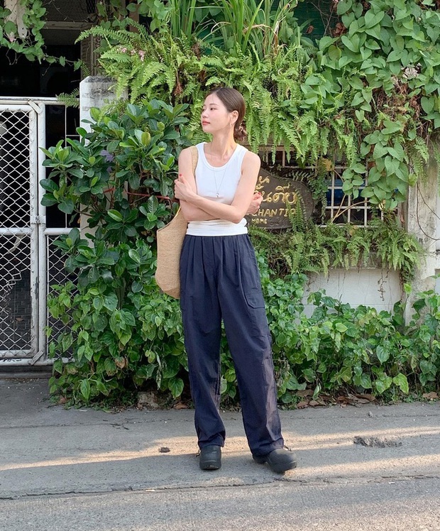 Bạn nên tham khảo set đồ trên cho chuyến du lịch. Công thức áo hai dây trắng và quần túi hộp màu đen tạo nên bộ trang phục quyến rũ mà vẫn cá tính, năng động. Chiếc túi cói cỡ lớn vừa tiện dụng, vừa phù hợp với phong cách du lịch mùa hè. Thiết kế áo ôm nhẹ, dáng lửng còn cho hiệu quả "ăn gian" chiều cao.