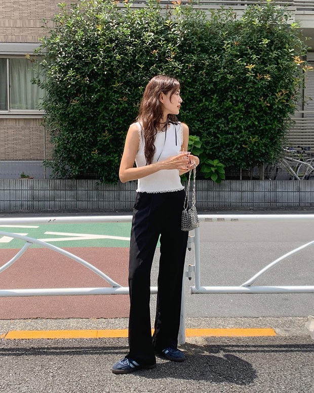 Công thức áo hai dây và quần âu màu đen toát lên sự phóng khoáng, sành điệu. Dẫu vậy, set đồ này vẫn ghi điểm tinh tế. Các nàng nên sơ vin để nâng cấp vẻ sang xịn mịn của tổng thể trang phục. Đôi sneaker trắng rất phù hợp với bộ đồ. Mẫu giày này có sự trẻ trung và trang nhã.