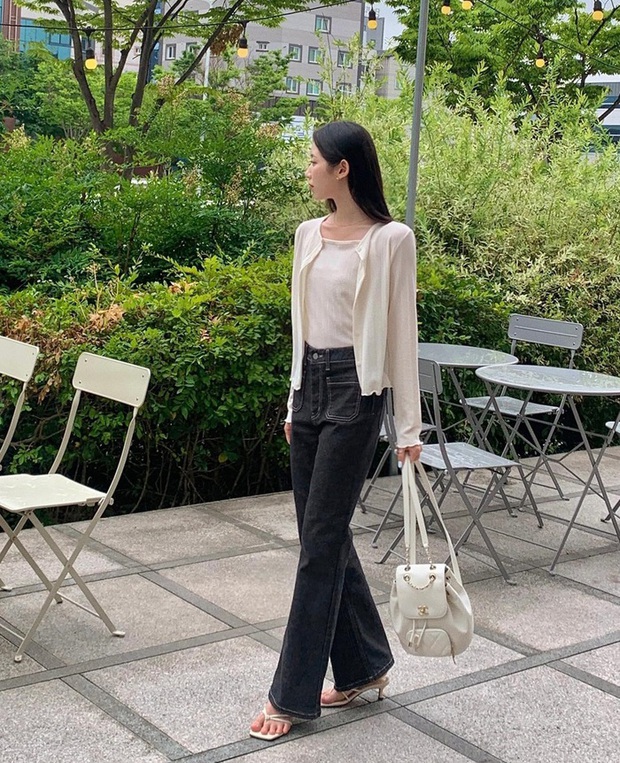 Nữ tính và trang nhã là ấn tượng về công thức áo hai dây kết hợp với cardigan mỏng đồng bộ, quần jeans đen ống suông và sandal cao gót quai mảnh. Bộ trang phục này phù hợp để diện tới công sở. Ưu điểm của set đồ trên còn là khả năng che nắng, nhờ mẫu áo cardigan mỏng dài tay.