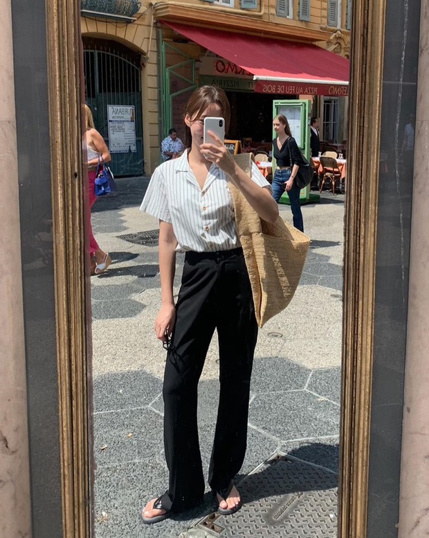 Bên cạnh áo trơn màu, bạn hãy đổi mới phong cách với những chiếc áo họa tiết. Công thức áo sơ mi kẻ sọc cộc tay kết hợp với quần màu đen đã tạo nên set trang phục trẻ trung, và không kém phần thanh lịch. Bộ trang phục trở nên nổi bật hơn nhờ thiết kế túi cói cỡ lớn. Không chỉ phù hợp để diện tới công sở, bạn còn có thể áp dụng công thức này đi dạo phố.