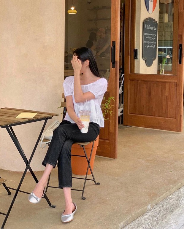 Những nàng yêu thích sự nữ tính hãy tham khảo công thức gồm áo blouse trắng tay bồng kết hợp cùng quần jeans đen. Đôi giày búp bê gắn nơ mảnh rất phù hợp với bộ trang phục duyên dáng. Bên cạnh đó, tông màu ánh bạc của đôi giày còn tạo điểm nhấn nổi bật cho người diện.