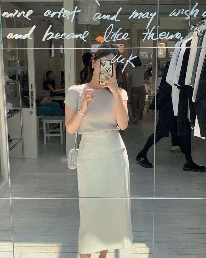Công thức áo thun và chân váy trắng tuy rất đơn giản nhưng vẫn hút mắt. Những khi "lười" phối đồ cầu kỳ nhưng vẫn muốn ghi điểm phong cách, chị em hãy áp dụng combo trên. Thao tác sơ vin sẽ giúp nâng tầm những set đồ đơn giản.