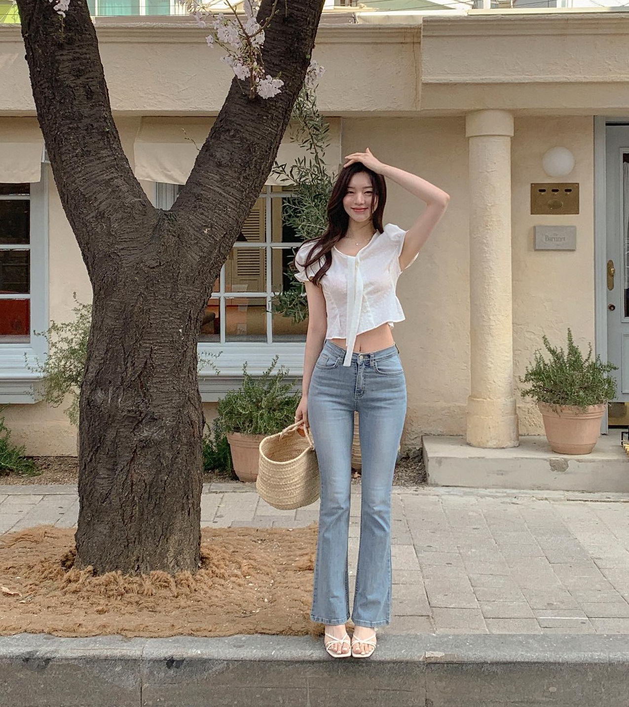 Kết hợp quần jeans ống loe với áo blouse trắng dáng lửng, chị em không cần sơ vin mà vẫn có tổng thể cao ráo. Vẻ ngoài của người diện trở nên nữ tính, bay bổng hơn nhờ chiếc túi cói và đôi sandal quai mảnh.
