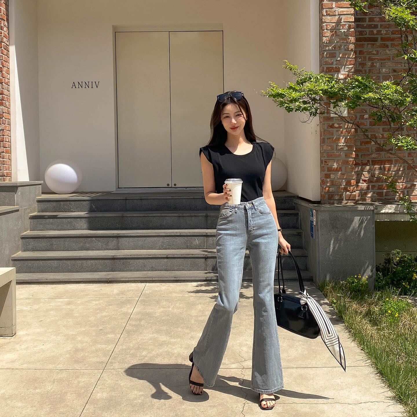 Thêm một set đồ đơn giản mà sành điệu nữa chị em có thể ghim cho những buổi dạo phố cuối tuần, đó là công thức áo thun màu đen và quần jeans xanh. Với các bí kíp đơn giản như sơ vin, chọn giày và túi xách màu trung tính, tổng thể trang phục sẽ thêm phần sang xịn mịn.