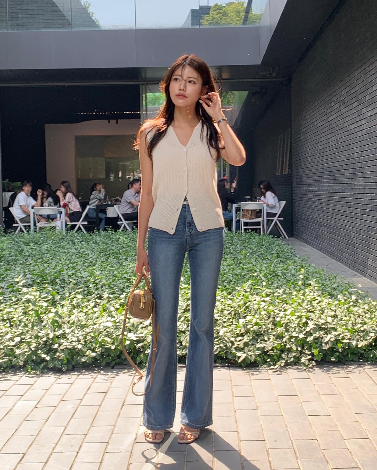 Yêu thích phong cách tối giản, chị em hãy tham khảo công thức gồm áo gile dệt kim kết hợp với quần jeans xanh ống loe. Công thức này ghi điểm ở sự nữ tính và sang xịn mịn. Đôi sandal tông màu trắng và túi xách màu nâu đã đảm bảo sự hài hòa, tinh tế cho outfit.