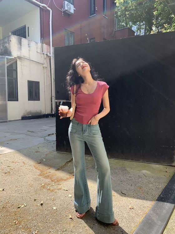 Công thức áo thun ôm dáng và quần jeans ống loe đã mang đến nét retro cho người diện. Vậy nên, dù diện đồ có tông màu trang nhã làm chủ đạo, quý cô trên vẫn nổi bật. Những món đồ như túi cói, sandal rất phù hợp với nét phóng khoáng của outfit.