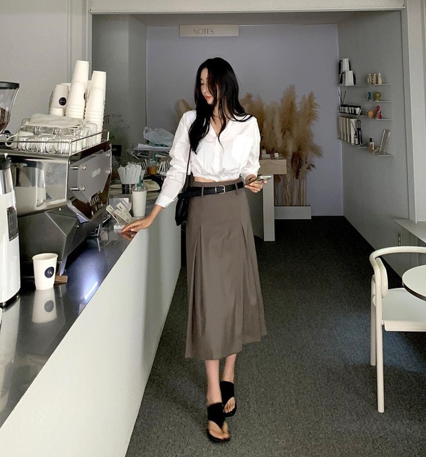 Đơn giản nhưng vẫn có sự phóng khoáng là bộ trang phục gồm áo sơ mi trắng dáng lửng kết hợp với chân váy màu xám, có chi tiết xếp ly. Hiệu quả tôn dáng được tăng thêm nếu chị em đi giày cao gót.