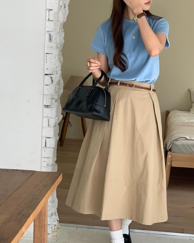 Khi thời tiết chưa lạnh hẳn, chị em vẫn có thể tận dụng những chiếc áo cộc tay từ mùa hè. Sự kết hợp giữa áo màu xanh nhạt và chân váy màu be đã tạo nên bộ trang phục trẻ trung, ngọt ngào nhưng không kém phần sang xịn mịn. Bộ cánh được nâng tầm nhờ chiếc thắt lưng mảnh, tông màu nâu.