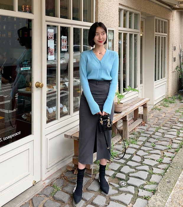 Áo cardigan màu xanh tạo điểm nhấn nổi bật và trẻ trung cho set trang phục. Bộ cánh thêm phần ấn tượng nhưng vẫn trang nhã nhờ mẫu chân váy dài xẻ tà, tông màu xám trầm. Đôi giày mũi nhọn giúp vóc dáng thêm thanh thoát và cũng phù hợp với nét thanh lịch của set đồ.