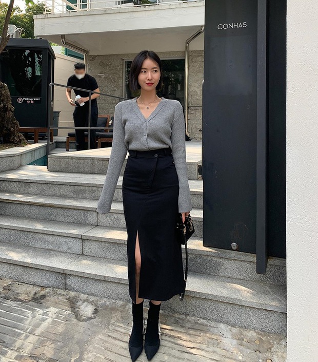 Chân váy xẻ tà là món thời trang chị em nên lưu tâm. Phiên bản chân váy này không chỉ giúp vẻ ngoài thêm nổi bật mà còn cho hiệu quả kéo chân dài, từ đó "ăn gian" chiều cao. Đơn giản nhất, bạn hãy kết hợp chân váy xẻ tà với áo cardigan màu trung tính để tạo nên bộ trang phục thanh lịch, chuẩn mốt.