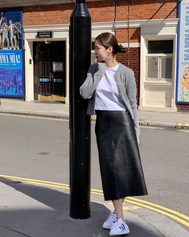Chân váy da sành điệu và nổi bật nên chị em không cần quá cầu kỳ khi diện món đồ này. Hãy kết hợp chân váy da với áo thun trắng, cardigan xám và giày sneaker trắng. Công thức này có sự hài hòa, thanh lịch và không kém phần tinh tế. Ngoài ra, outfit còn cho hiệu quả "hack" tuổi tối ưu.