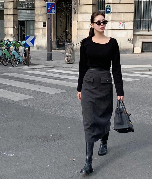 Set đồ trên mang toàn tông màu đen, nhưng không hề khiến người mặc "dừ" đi. Lý do là bởi, bộ trang phục gồm các item thời thượng như là áo cổ vuông, chân váy suông và boots cao cổ. Trang phục toàn màu đen rất được ưa chuộng trong mùa lạnh. Công thức này tạo hiệu ứng vóc dáng thanh mảnh và giúp người mặc có được vẻ ngoài sang trọng.