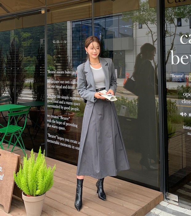 Công thức áo thun xám và chân váy chữ A khá đơn giản. Tuy nhiên, nhờ chiếc áo blazer dáng lửng khoác ngoài, người diện trông nổi bật hơn. Những chi tiết như thắt lưng da, đôi boots thấp cổ đều có tác dụng nâng tầm vẻ sang trọng cho outfit.
