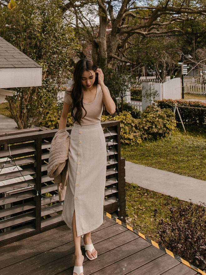 Khi đi dạo phố hoặc du lịch, chị em hãy tham khảo công thức gồm áo màu be kết hợp với chân váy suông, vải thô. Thao tác sơ vin và đôi giày mule cao gót giúp người mặc ghi trọn điểm phong cách. Ngoài ra, chi tiết xẻ tà còn giúp kéo chân thon dài.